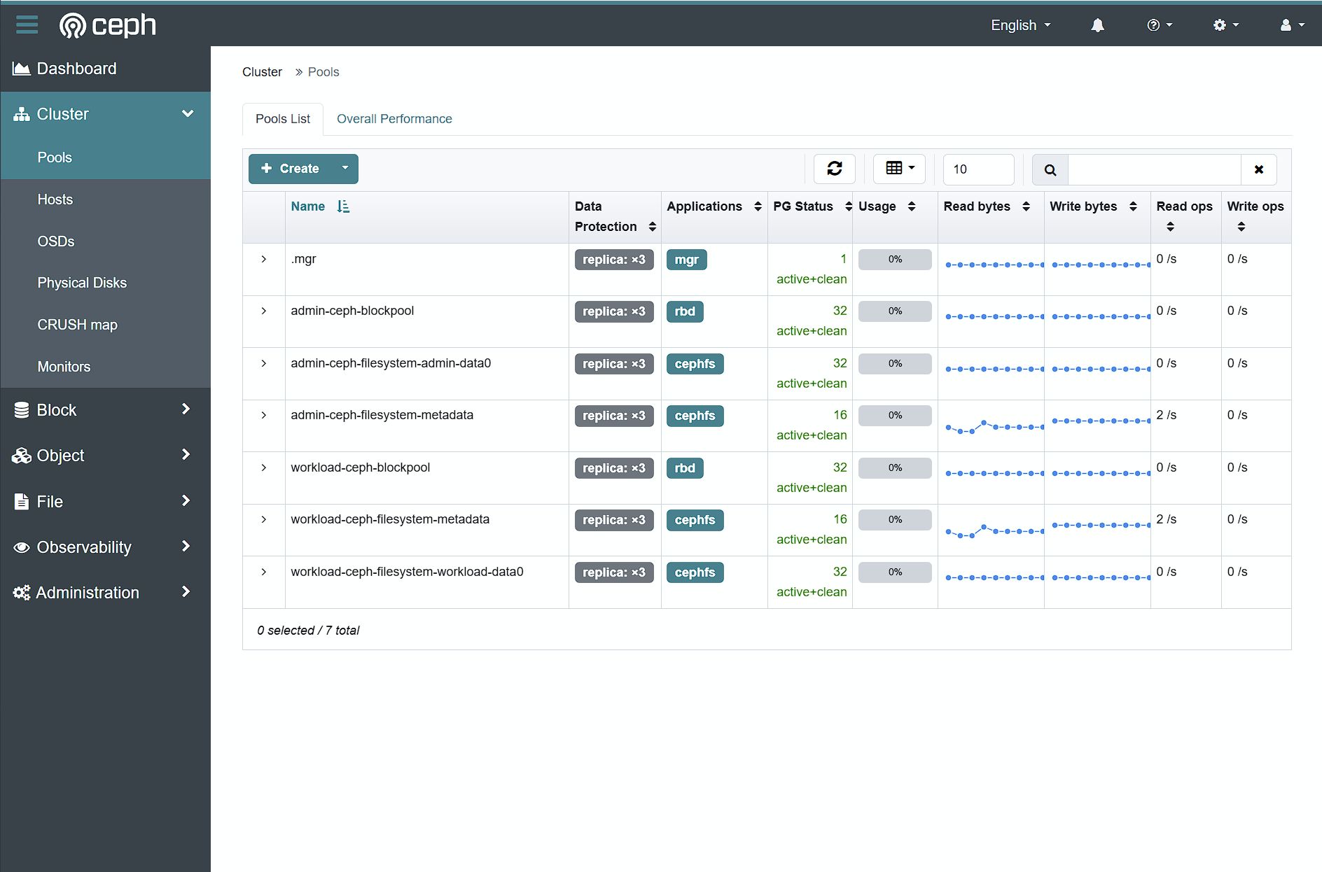 - Total Isolation: In the Ceph dashboard, you can see I’ve carved out dedicated storage pools for block (RBD) and file (CephFS) storage—strictly separated for admin and workload traffic